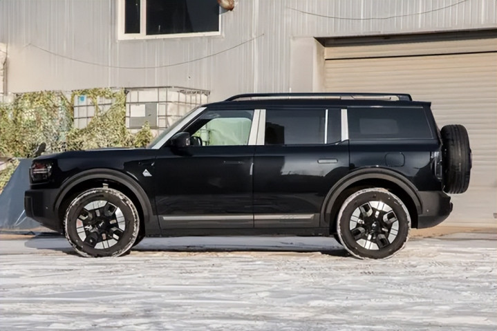 来到侧面,整车比例舒展,黑色轮眉与侧裙包围强化越野属性,高离地间隙在视觉上带来更强通过感。隐藏式门把手与低风阻轮圈设计,则让它在硬朗外形之中融入科技气质。车窗面积较大,侧面玻璃通透感不错,对家庭用户来说,后排孩子不会有压抑感。