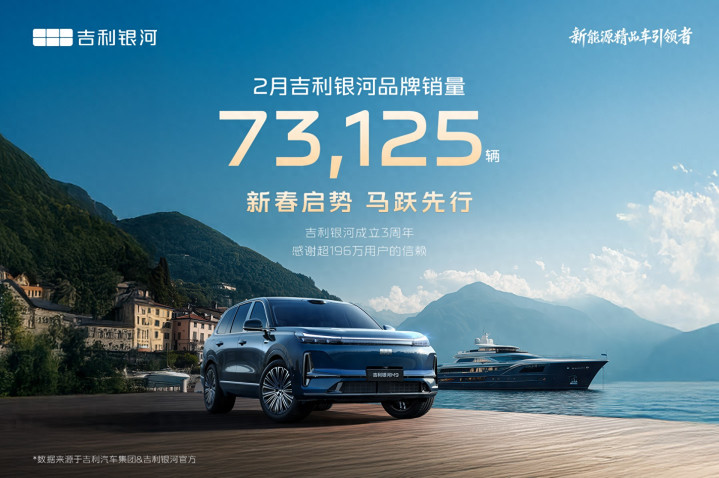 3月1日,吉利银河发布最新销量数据。2月,吉利银河销量达73125辆(含出口)。1-2月,吉利银河销量达156115辆,强势领跑新能源汽车市场。截至目前,吉利银河品牌累计销量超196万辆。成立三周年,吉利银河以爆款标杆重塑价值,持续刷新“银河速度”。